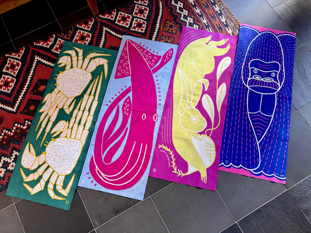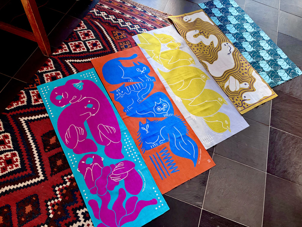 こちらは『手捺染』という技法を用いて日本国内の工房にて1枚1枚仕上げた手ぬぐいです。裏面まで色の通ったその風合いも楽しんでいただきたいという想いから、その時々でカラーを変更しながら制作しております。